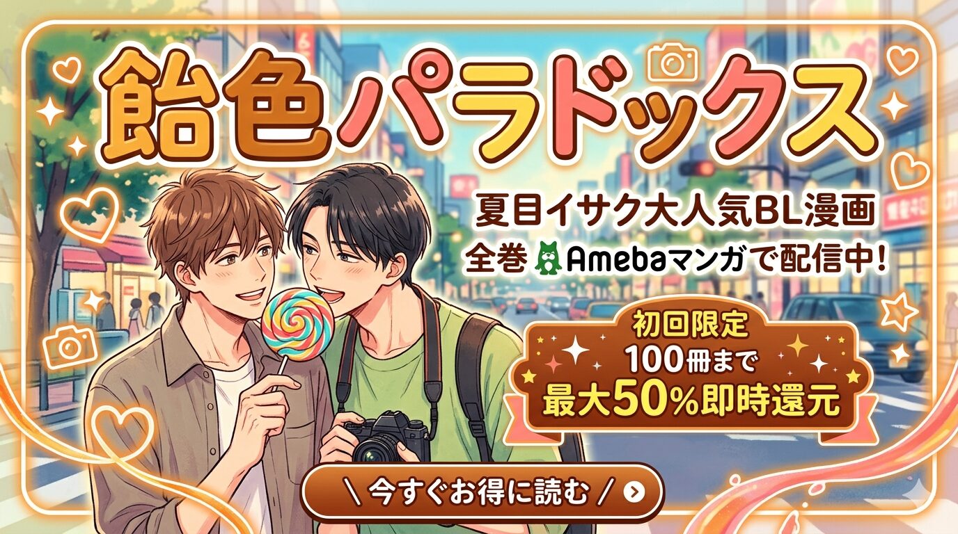 「飴色パラドックス」は全7巻+番外編がAmebaマンガで配信中です。初回限定の100冊まで最大50%即時還元クーポンを使えば、全巻まとめ買いでも大幅に安く読めます。この記事では、作品の魅力から口コミ、お得な購入方法まで徹底的に解説します。
