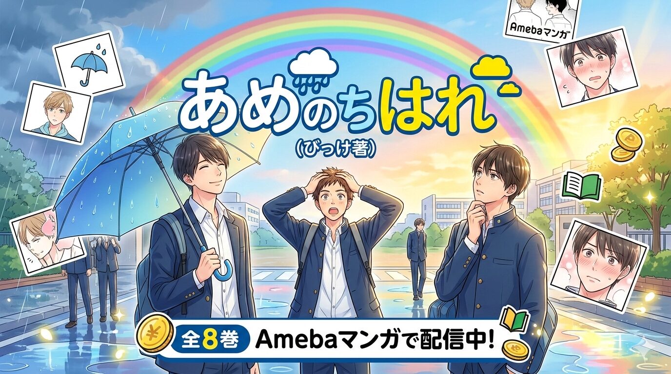 「あめのちはれ」を気に入った方には、同じく独特の関係性が魅力のBL・恋愛作品もおすすめです。タイトルに「あめ」つながりの作品として、「あめとむち」全巻まとめ買いはいくら?Amebaマンガの50%還元で最安で読む方法【2026年2月最新】もぜひチェックしてみてください。