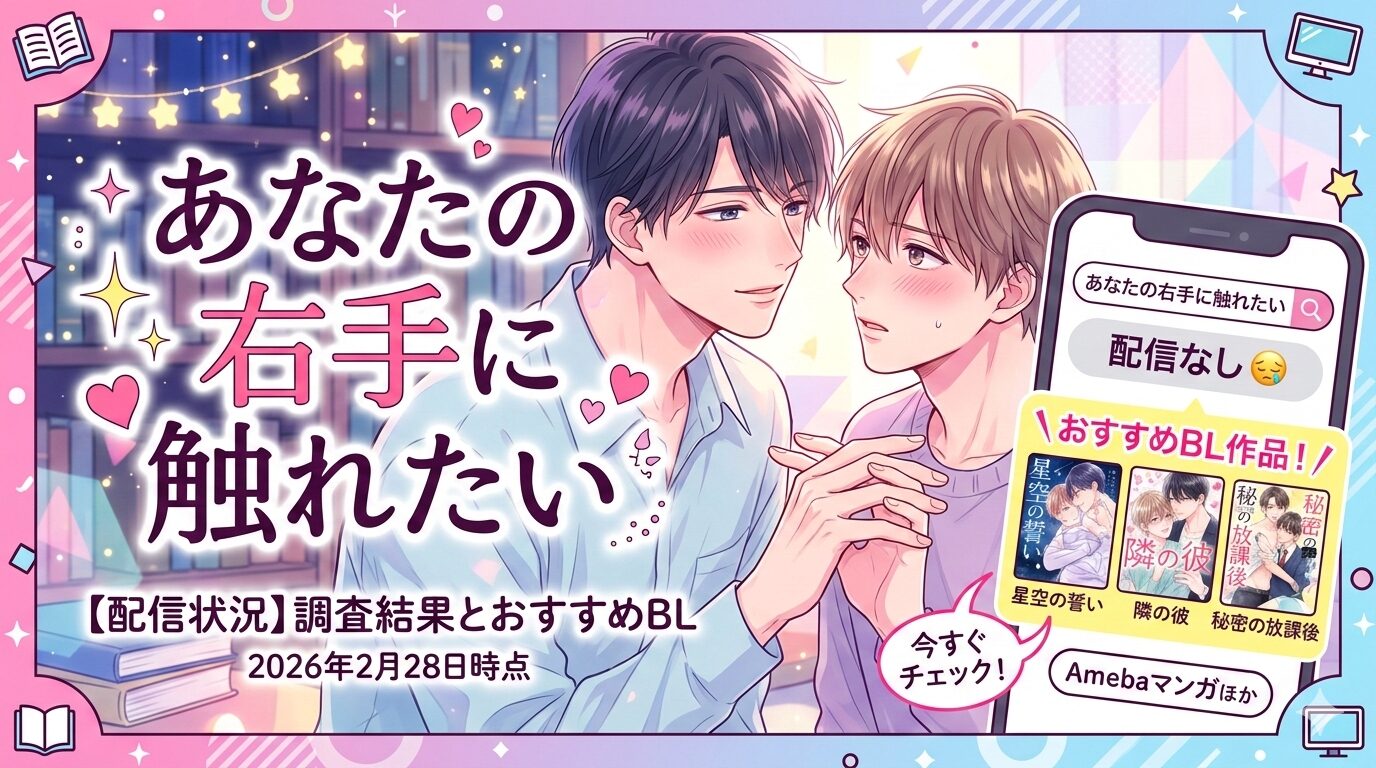 「あなたの右手に触れたい」をまとめ買いしたいと思って検索したあなたへ。結論からお伝えすると、2026年2月28日時点で「あなたの右手に触れたい」という作品はAmebaマンガを含む主要電子書籍サービスでの配信が確認できません。本記事では調査結果の詳細と、代わりにおすすめのBL作品をご紹介します。