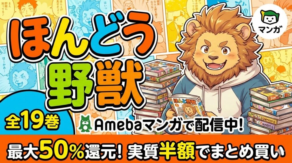 「ほんと野獣」は全19巻がAmebaマンガで配信中です。新規登録時の100冊まで最大50%即時還元クーポンを使えば、通常11,400円の全巻セットが実質約5,700円で購入できます。2026年2月22日時点の最新情報をもとに、最安でまとめ買いする方法から作品の魅力まで... -