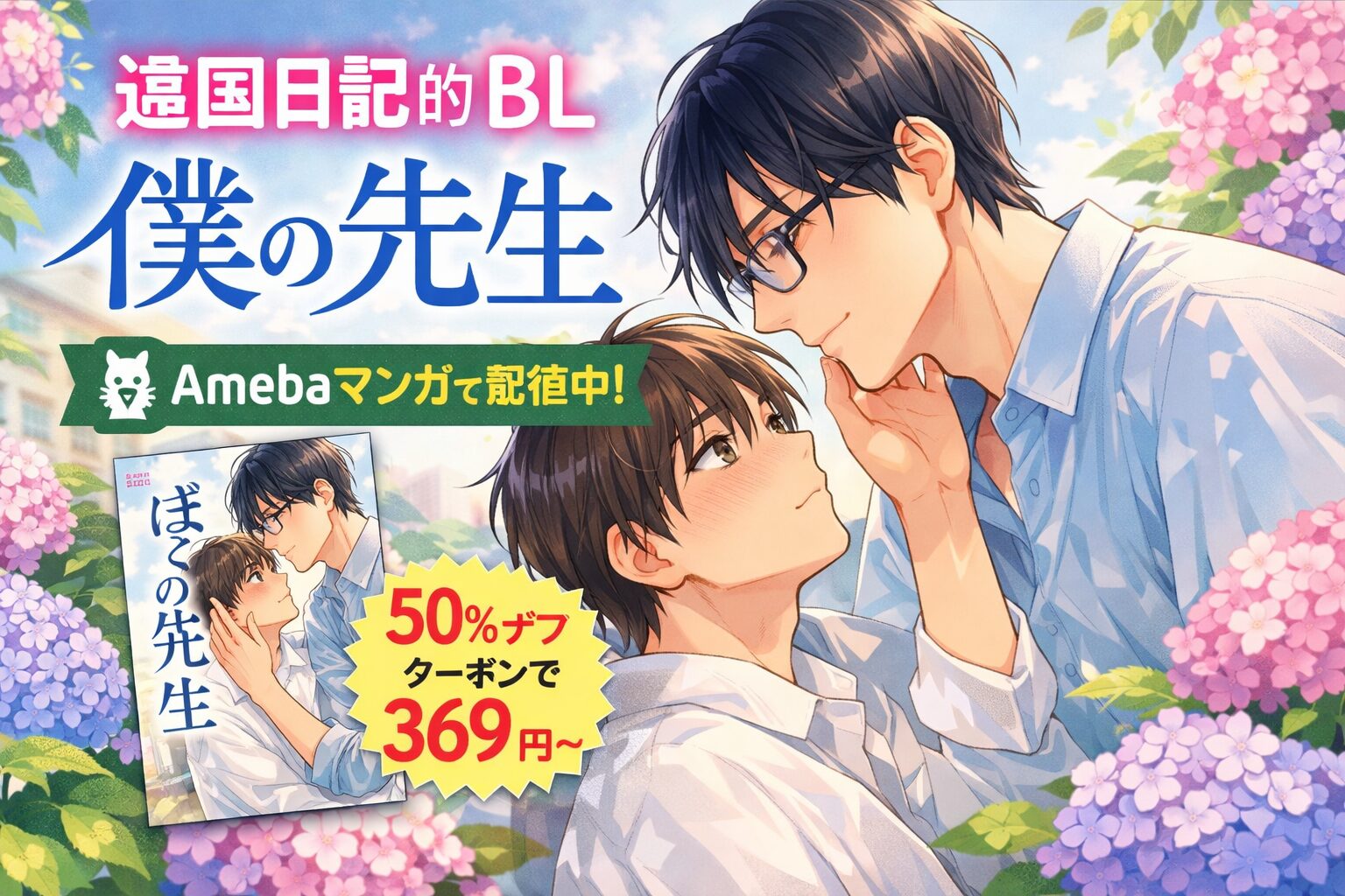 Amebaマンガに新規会員登録した際に自動付与されます。100冊まで最大50%が即時還元されるクーポンで、初回購入時に適用できます。『ぼくの先生』1冊だけでなく、気になるBL作品を複数冊まとめて購入するとさらにお得です。