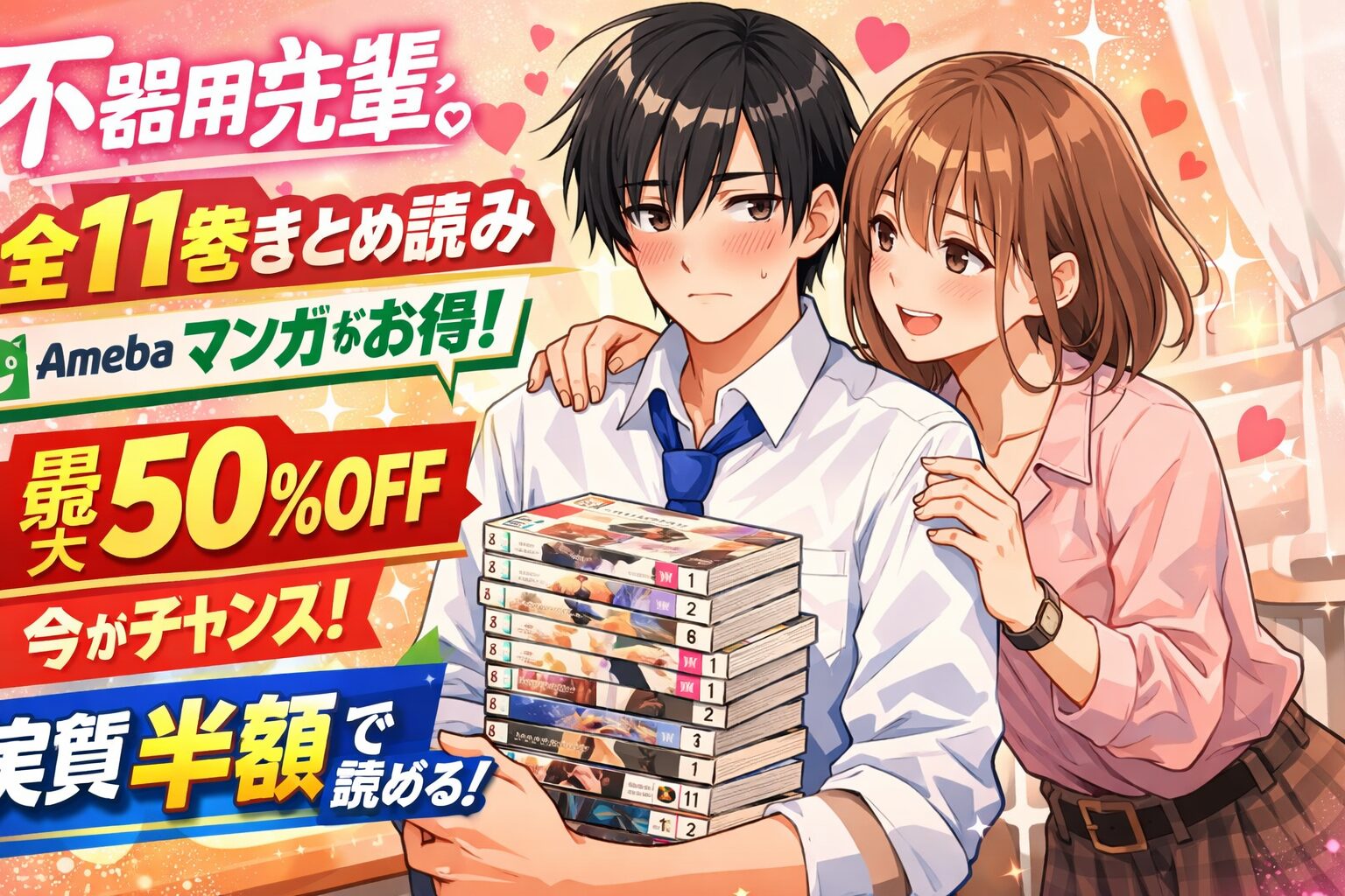 「不器用な先輩。」を全巻まとめ買いしたいなら、Amebaマンガがもっともお得です。全11巻が配信中で、新規登録の100冊まで最大50%即時還元クーポンを使えば、通常8,470円(税込)のところ実質約4,235円で一気読みできます。2026年2月に完結したばかりの今こそ、まとめ買いの絶好のタイミングです。