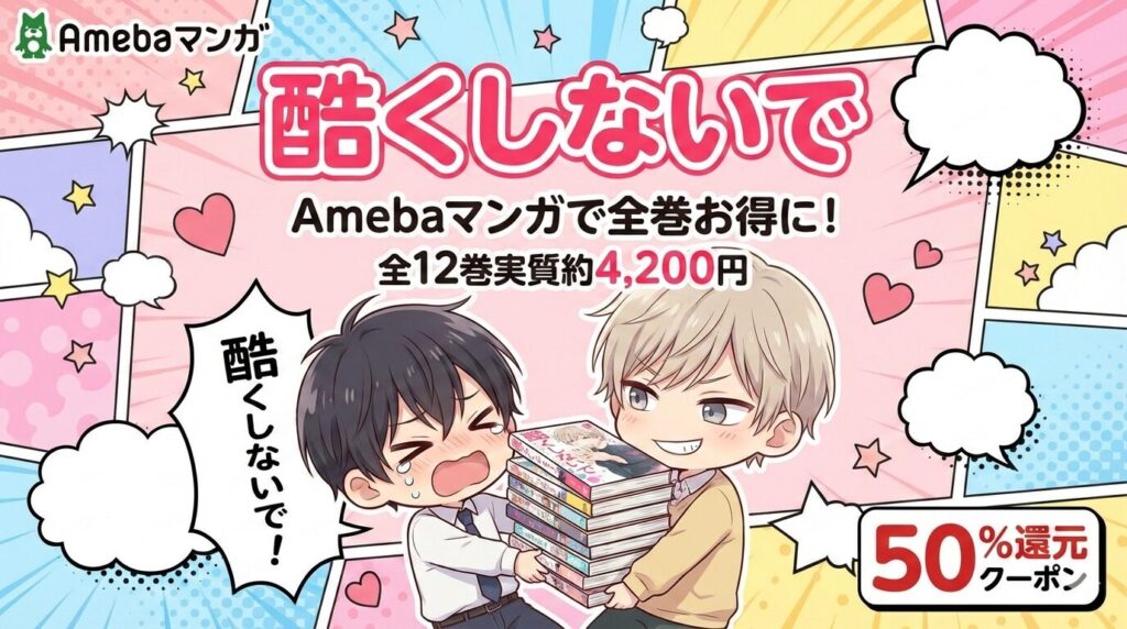 ねこ田米蔵先生の大人気BL漫画「酷くしないで」は、Amebaマンガなら全12巻を実質約4,200円でまとめ買いできます。新規登録で100冊まで50%即時還元クーポンが使えるため、全巻一気読みしたい方にとって最もお得な方法です。 結論:「酷くしないで」はAmeba... -