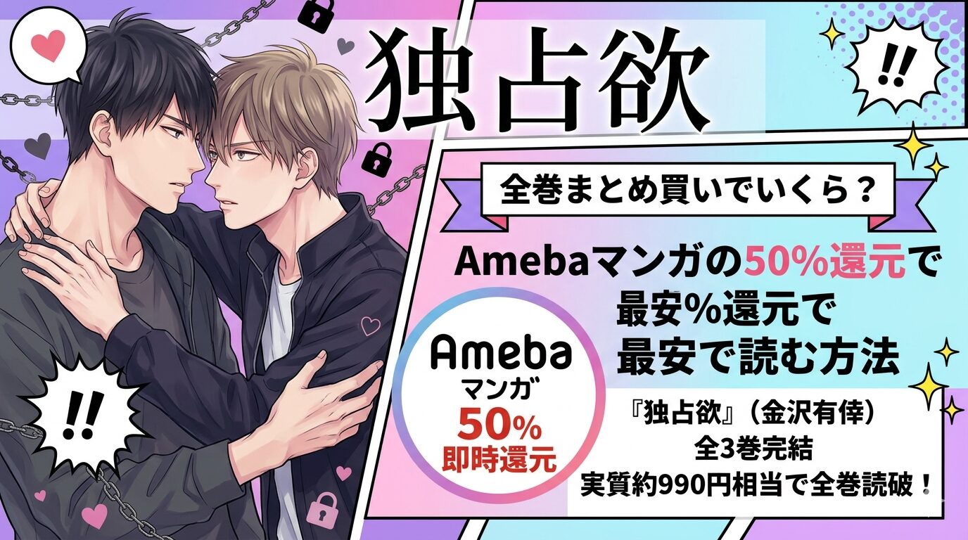 『独占欲』(金沢有倖)は全3巻完結のBLマンガで、Amebaマンガなら全巻1,980円(税込)で購入できます。さらに新規登録の100冊50%即時還元クーポンを使えば、実質約990円相当で全巻読破が可能です。この記事では、作品のあらすじや見どころ、口コミ評判に加えて、最もお得にまとめ買いする方法を詳しく解説します。