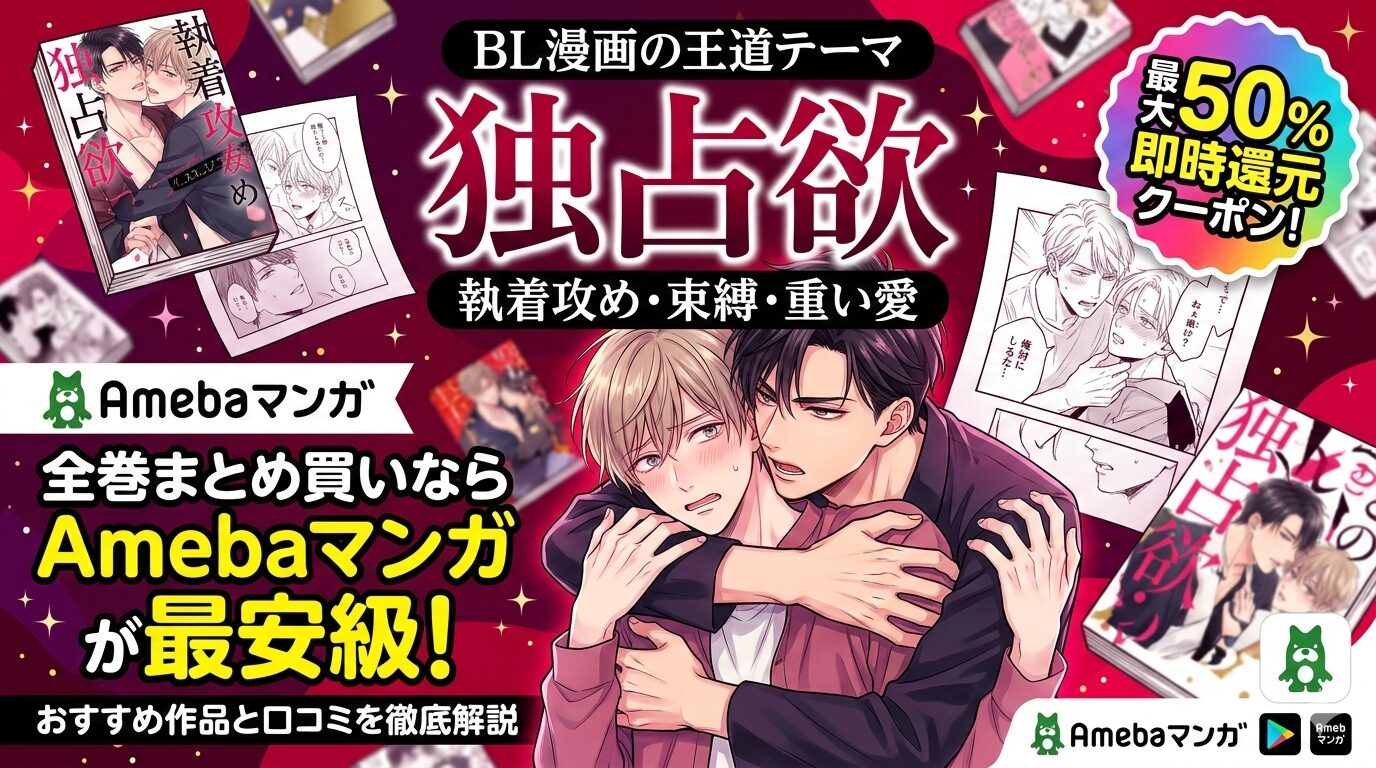「独占欲」をテーマにしたBL漫画は、攻めキャラの激しい執着や嫉妬、束縛といった”重い愛”が読者の心を鷲掴みにするジャンルです。全巻まとめ買いで一気読みしたいなら、100冊まで最大50%即時還元が使えるAmebaマンガが断然おすすめです。この記事では、独占欲系BLの人気作品やお得な購入方法を詳しくご紹介します。