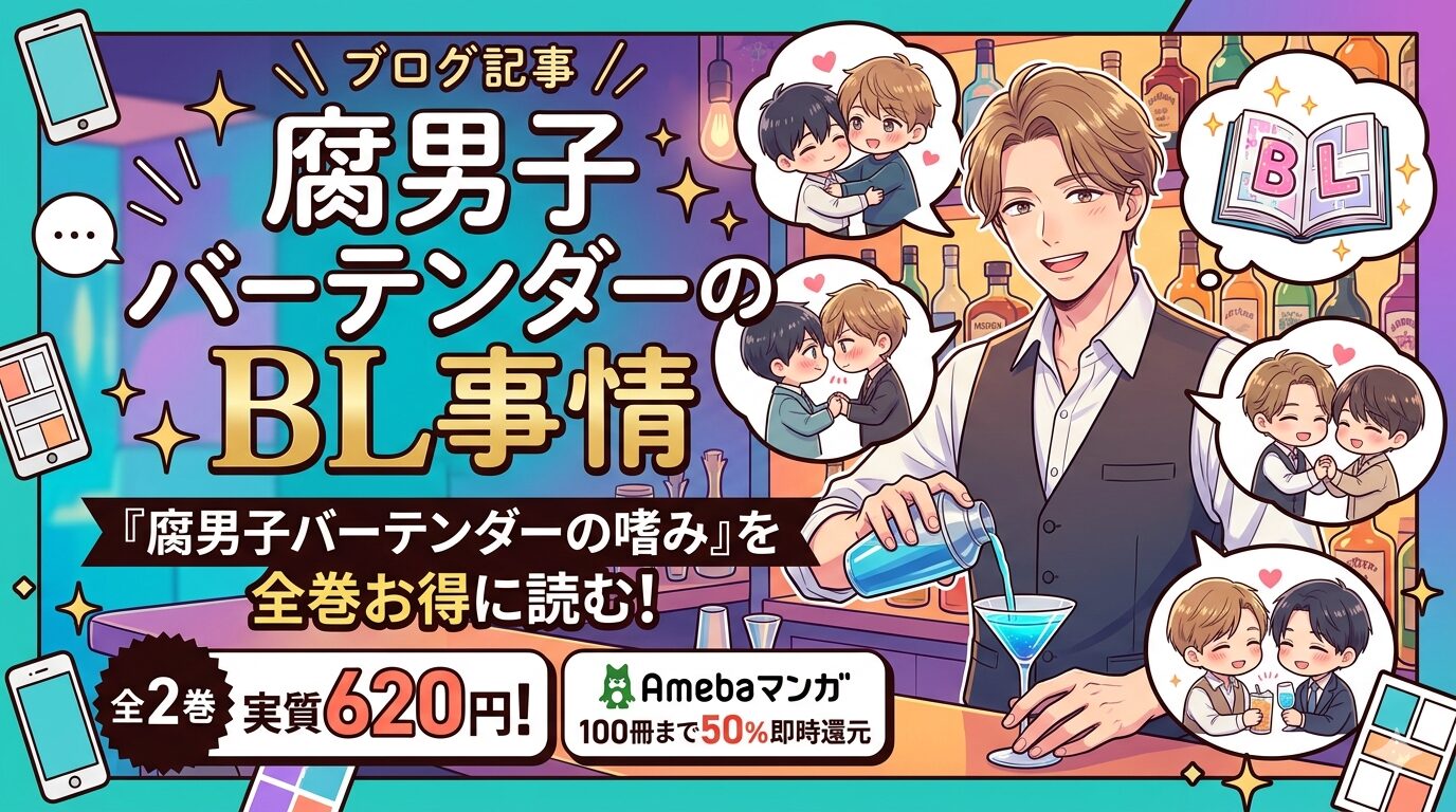 「腐男子バーテンダーのBL事情」で検索してこの記事にたどり着いた方、お探しの作品は『腐男子バーテンダーの嗜み』(なる粉 著/一迅社)です。全2巻完結のこの作品は、Amebaマンガなら新規登録の100冊50%即時還元クーポンを使って、定価1,240円のところ実質620円で全巻まとめ買いできます。