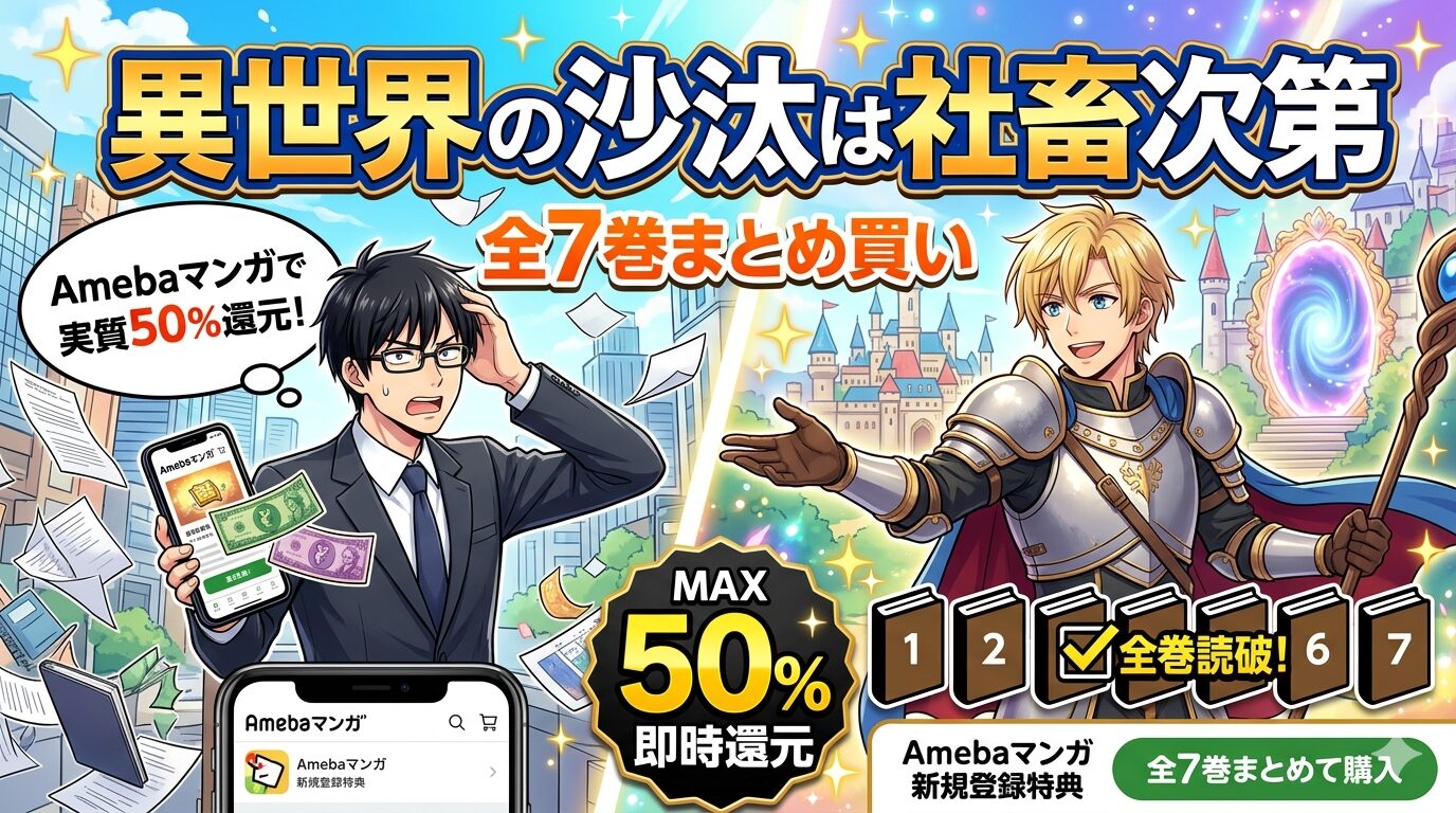 「異世界の沙汰は社畜次第(いせしゃち)」の漫画全7巻をまとめ買いするなら、Amebaマンガの新規登録100冊まで最大50%即時還元を使うのが最もお得です。定価約5,291円のところ、実質約2,646円で全巻揃えることができます。2026年1月からのアニメ放送で話題沸騰中の今、原作漫画をお得に一気読みしましょう。