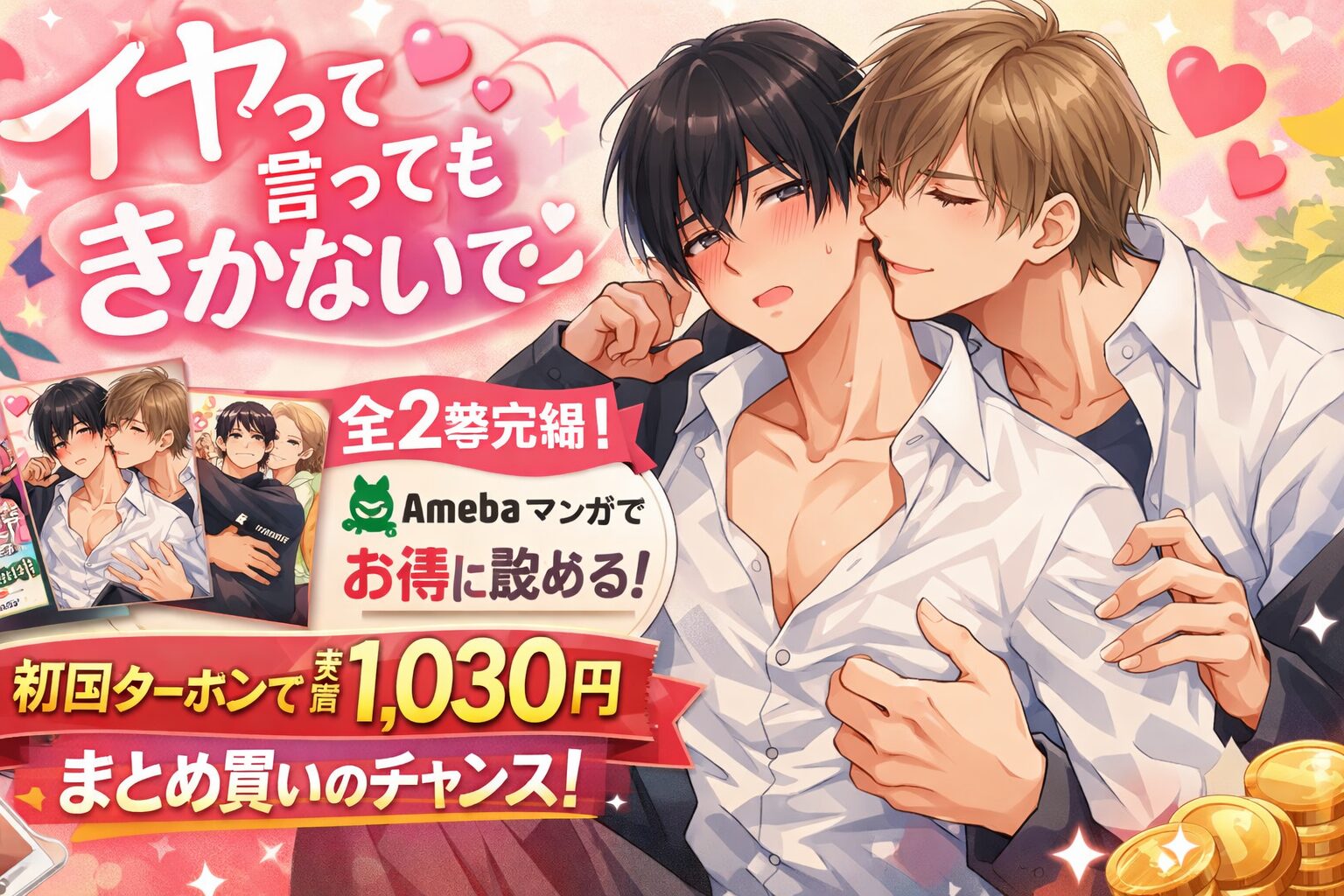 「イヤって言ってもきかないで」は全2巻(上下巻)完結のBLコミックで、Amebaマンガなら初回クーポン適用で定価1,716円のところ実質約1,030円でまとめ買いできます。2026年2月24日時点の最新情報をもとに、最安値で読む方法から作品の魅力まで徹底解説します。