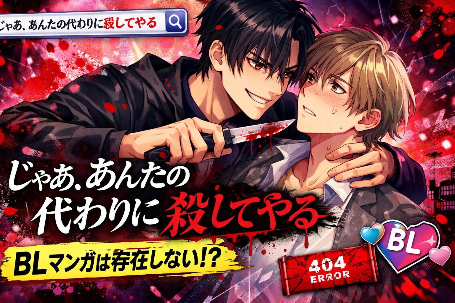 「じゃあ、あんたの代わりに殺してやる」で検索してBL作品を探している方へ結論からお伝えすると、このタイトルのBLマンガは2026年3月現在、存在が確認できません。似たタイトルの「じゃあ、君の代わりに殺そうか?」は青年サスペンス漫画であり、公式にはBLジャンルではありません。この記事では詳しい作品情報と、代わりにおすすめしたいBL作品やお得な読み方をご紹介します。