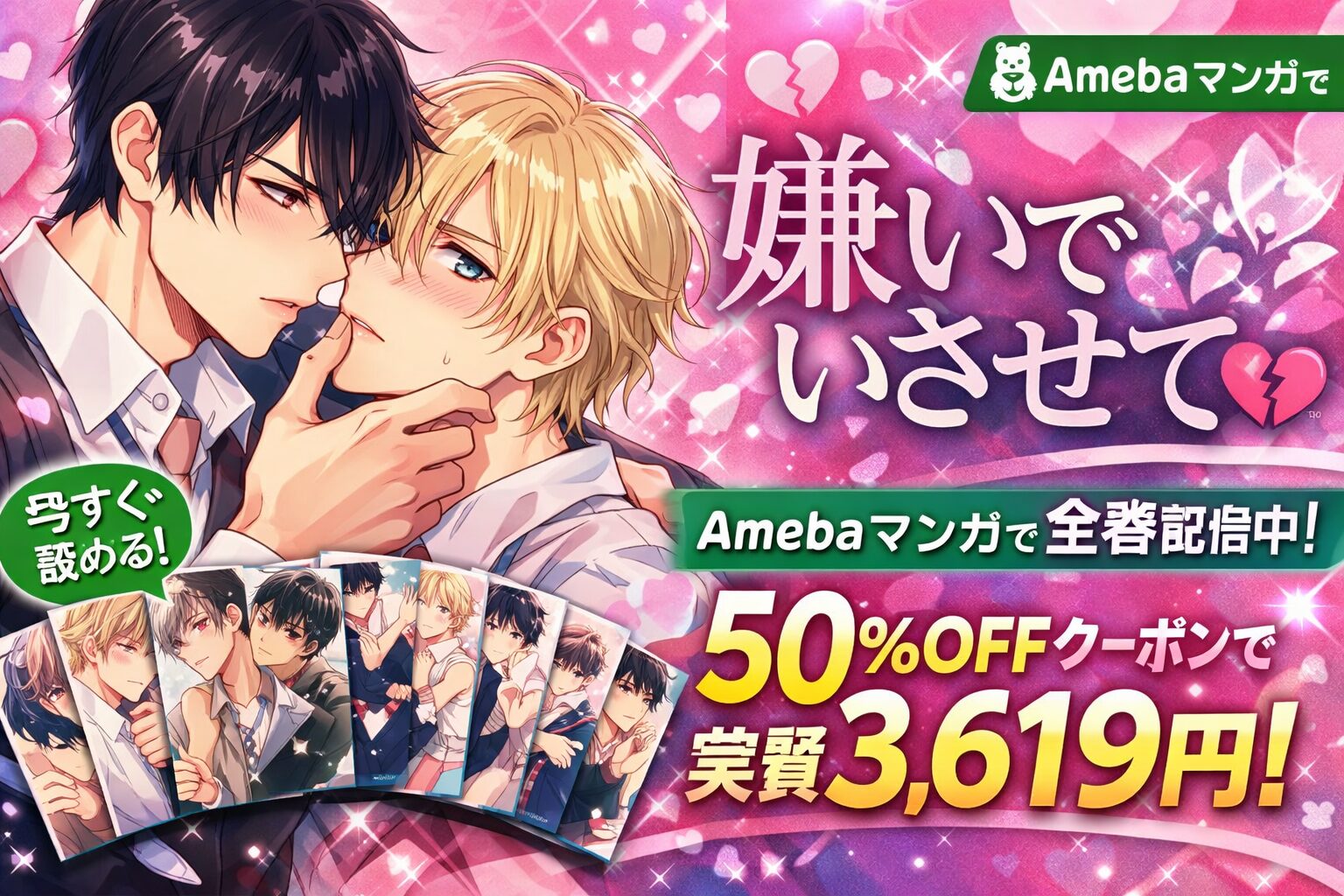 『嫌いでいさせて』はAmebaマンガで全9巻が配信中です。新規登録でもらえる100冊まで50%即時還元クーポンを使えば、定価約7,237円(税込)のところ実質約3,619円で全巻まとめ買いできます。2026年2月23日時点の最新情報をもとに、最安値で読む方法や作品の魅力を徹底解説します。
