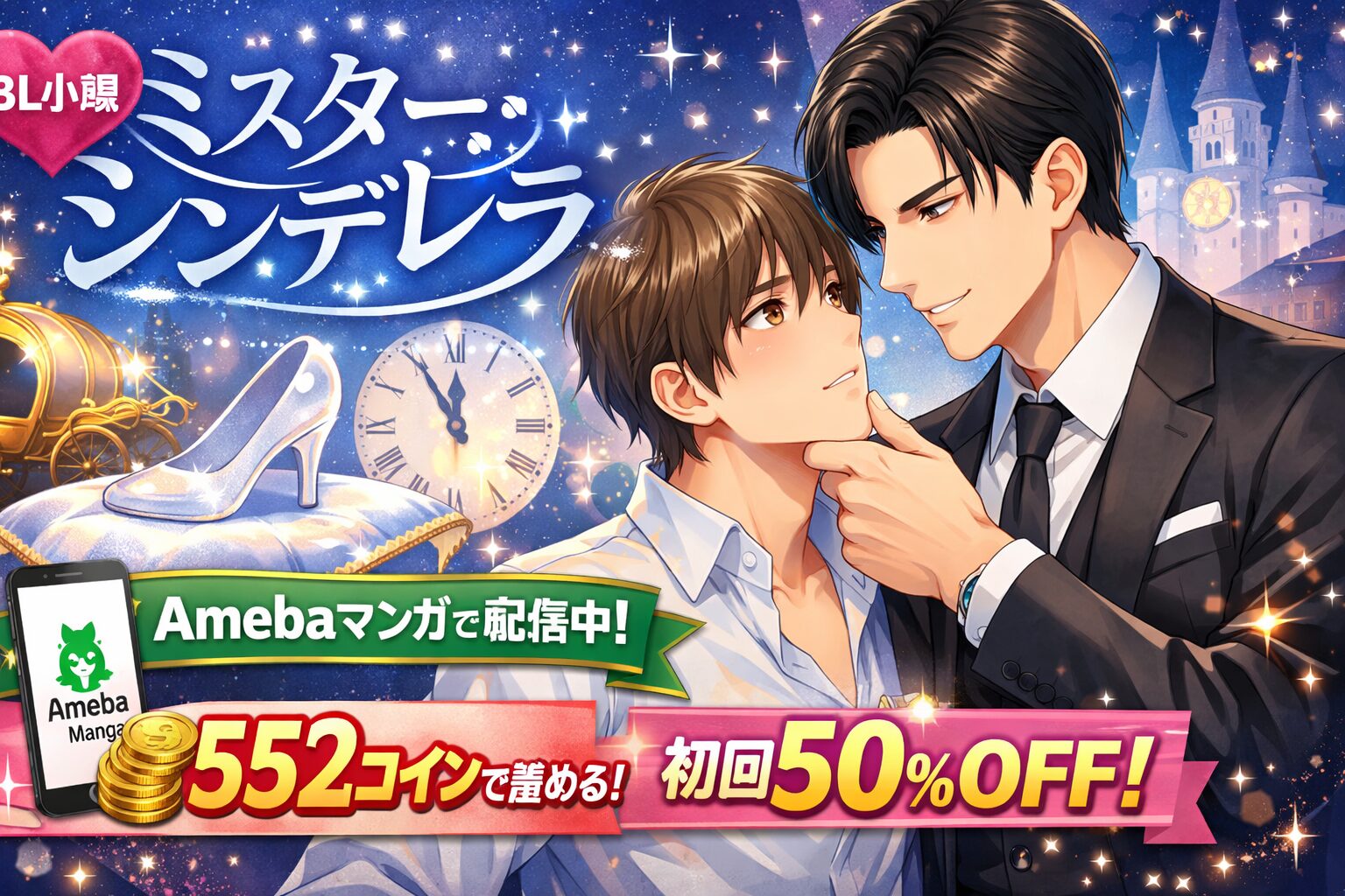 「ミスター・シンデレラ」でBL作品を探している方に向けて、配信状況と作品情報をお届けしました。BL漫画としての「ミスター・シンデレラ」は存在しませんが、BL小説『Mr.シンデレラ -義息が上司と恋をした-』はAmebaマンガで552コインにて配信中です。新規登録の100冊まで最大50%即時還元を活用すれば、実質約276コイン相当というお得な価格で読むことができます。