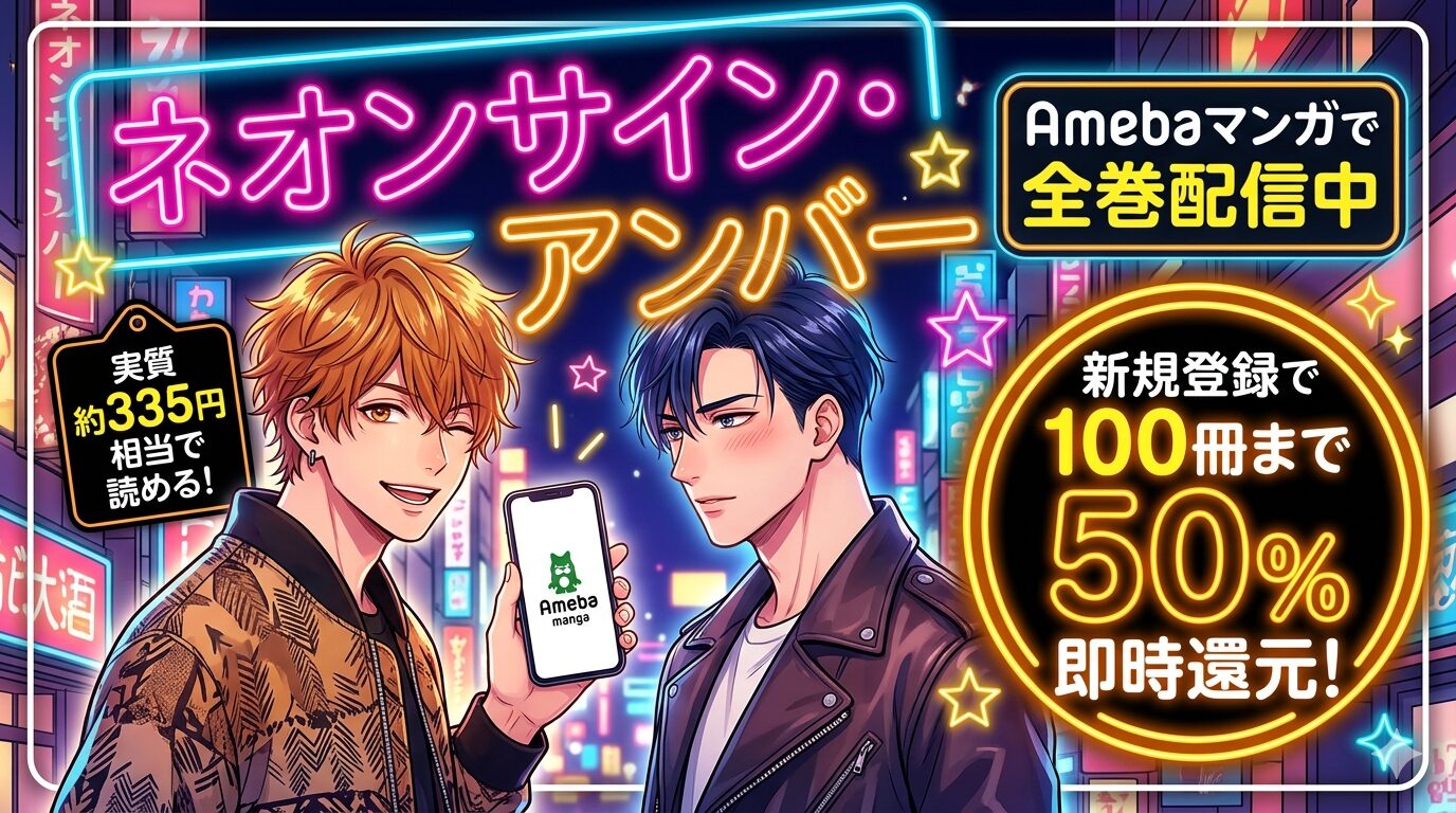 「ネオンサイン・アンバー」はAmebaマンガにて購入可能な作品です。本作は全1巻の完結作品のため、Amebaマンガで全巻を読むことができます。Amebaマンガでの価格は670マンガコイン(税込約670円相当)で、新規登録者向けの100冊まで最大50%即時還元クーポンを利用すれば実質約335円相当と非常にお得です。Amazon(★4.7)やちるちる(★4.3・神率60.3%)など各プラットフォームで高評価を獲得している名作BLを、この機会にぜひチェックしてみてください。
