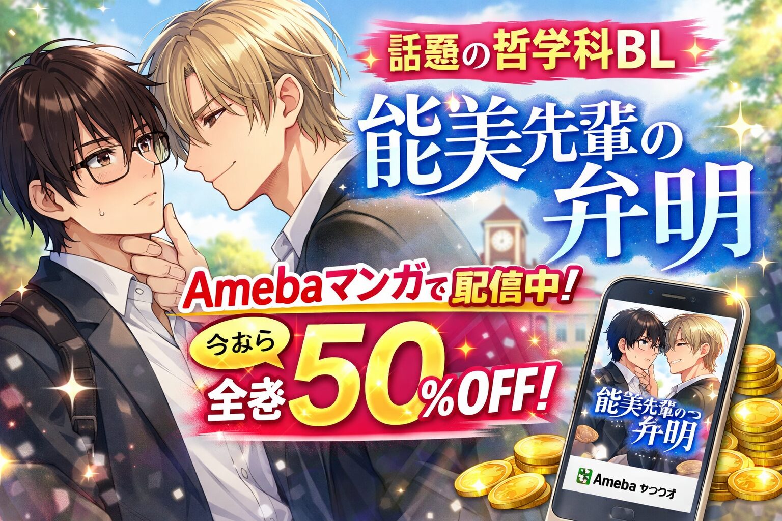 BLアワード2025総合コミック部門第1位に輝いた話題の哲学科BL『能美先輩の弁明』(大麦こあら)は、Amebaマンガで全巻配信中です。単行本版+番外編の全2冊は合計910コイン(約910円相当)で、新規登録の50%還元クーポンを使えば実質約455円相当で読めます。2026年2月時点の最新情報とともに、最もお得なまとめ買い方法を解説します。