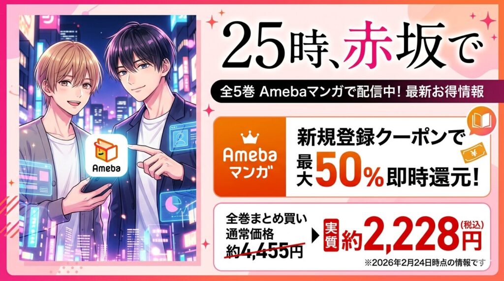 「25時、赤坂で」全巻まとめ買いはいくら?Amebaマンガの50%還元で最安で読む方法【2026年2月最新】