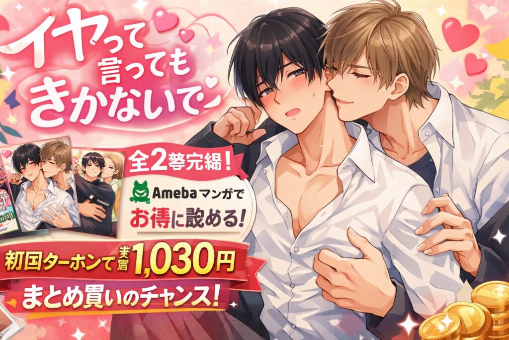 「イヤって言ってもきかないで」は全2巻(上下巻)完結のBLコミックで、Amebaマンガなら初回クーポン適用で定価1,716円のところ実質約1,030円でまとめ買いできます。2026年2月24日時点の最新情報をもとに、最安値で読む方法から作品の魅力まで徹底解説しま... -