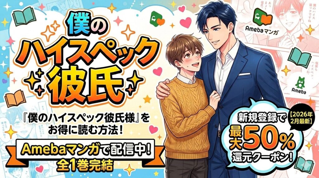 『僕のハイスペック彼氏様』はAmebaマンガで読める!全1巻をお得に購入する方法【2026年2月最新】 「ハイスペック彼氏」で検索してたどり着いた方へ。BLマンガとして該当する作品は、よつあし先生の『僕のハイスペック彼氏様』(全1巻・完結)です。結論か...