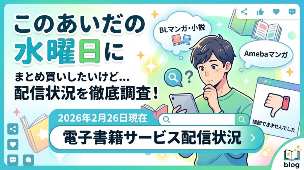 「このあいだの水曜日に」をまとめ買いしたいと考えて検索された方へ、結論からお伝えします。2026年2月26日現在、「このあいだの水曜日に」というタイトルのBLマンガ・小説は、Amebaマンガをはじめとする主要電子書籍サービスでの配信が確認できない状況... -