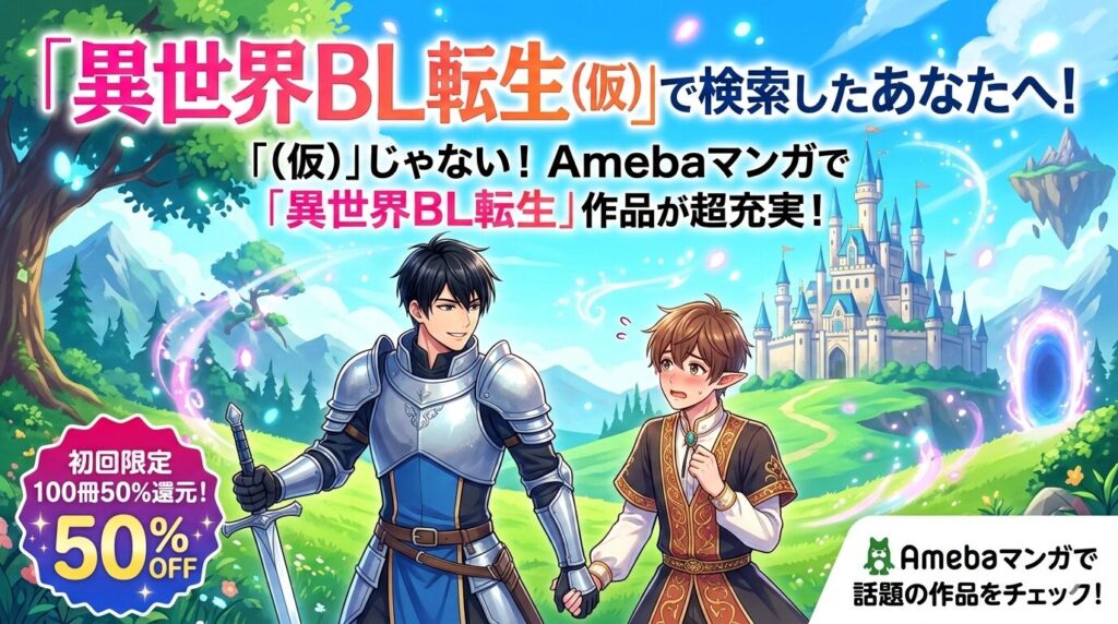 「異世界BL転生(仮)」で検索しているあなたへ。結論から言うと、「異世界BL転生(仮)」という正式タイトルの作品は存在しませんが、Amebaマンガでは異世界転生BLジャンルの作品が多数配信されています。初回限定の100冊50%還元クーポンを使えば、話題の... -