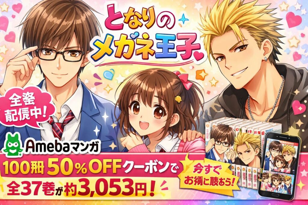 「となりのメガネ王子とヤンキーと!」は、電子累計3,100万DL突破の大人気少女マンガです。Amebaマンガなら全巻配信中で、初回限定の100冊50%還元クーポンを使えば実質約3,053円で全巻まとめ買いできます。この記事では、作品の魅力や口コミ、最もお得に読... -