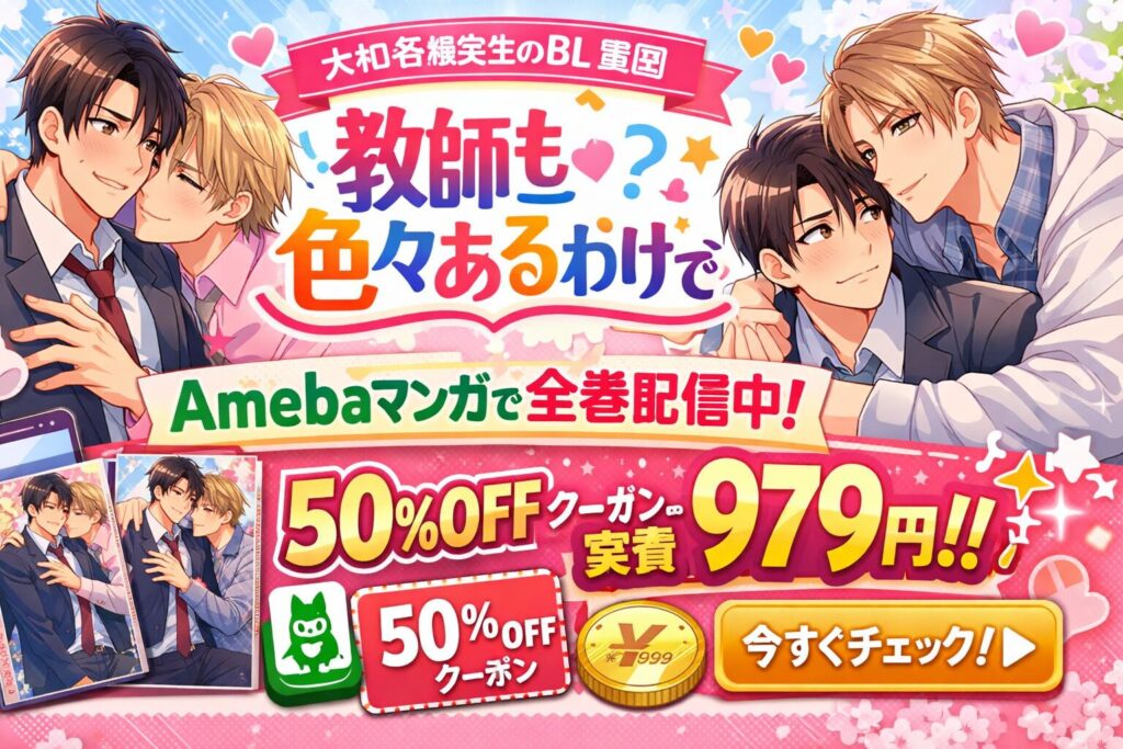 「教師も色々あるわけで」は大和名瀬先生によるBL漫画で、全3巻がAmebaマンガにて配信中です。初回限定の100冊まで50%即時還元クーポンを使えば、通常約1,957円のところ実質約979円で全巻まとめ買いできます。この記事では2026年2月22日時点の最新情報をも... -
