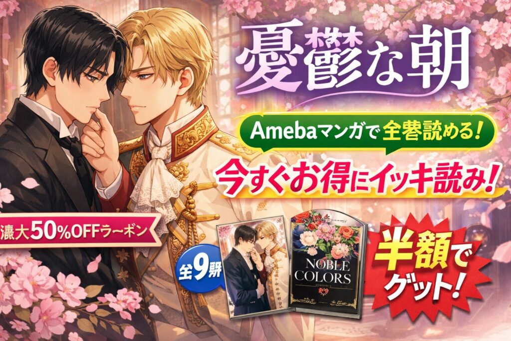 BL漫画の金字塔「憂鬱な朝」(日高ショーコ)は、Amebaマンガで本編全8巻+愛蔵版『NOBLE COLORS』の計9冊すべてを購入できます。新規登録時の100冊まで最大50%即時還元クーポンを使えば、全巻まとめ買いでも実質半額近くなる圧倒的なお得さです。明治華族... -