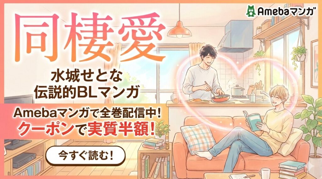 水城せとなの伝説的BLマンガ「同棲愛」は、Amebaマンガで電子版全4巻が配信中です。新規登録で使える100冊まで50%即時還元クーポンを活用すれば、全巻合計2,472円(税込)が実質約1,236円相当で手に入ります。この記事では作品の魅力から最安購入方法まで... -