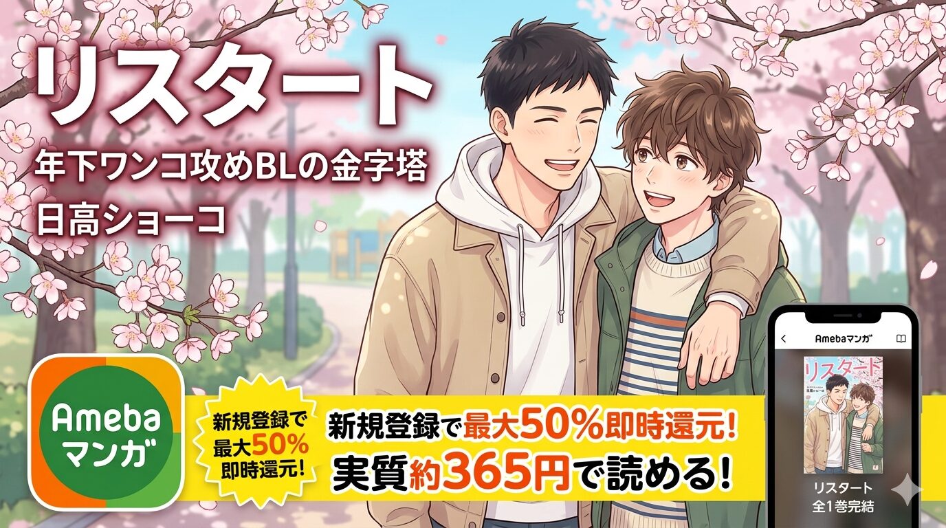 日高ショーコ先生のデビュー作にして、年下ワンコ攻めBLの金字塔として愛され続ける『リスタート』。全1巻完結のこの名作は、Amebaマンガなら新規登録特典の「100冊まで最大50%即時還元」を使って実質約365円で読めます。この記事では、作品の魅力から最安で読む方法まで徹底解説します。