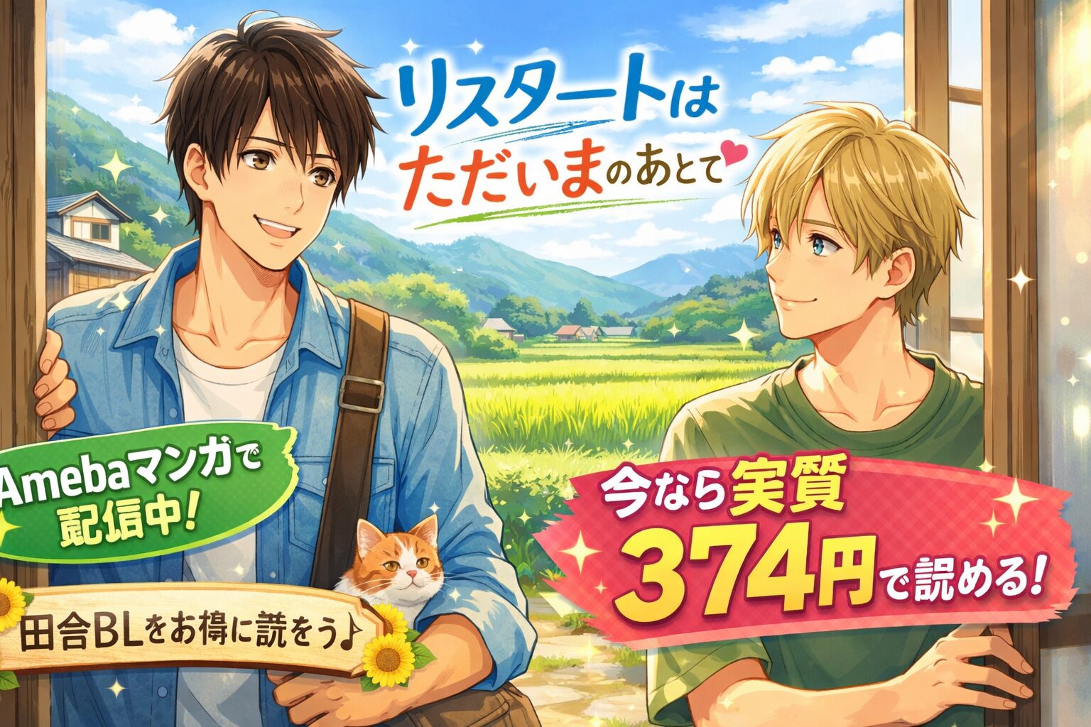 「リスタートはただいまのあとで」はAmebaマンガで配信中です。単行本版は全1巻完結で、通常価格748円(税込)。新規登録の100冊50%還元クーポンを使えば実質約374円で読めます。田舎BLの名作をお得に手に入れたい方は、今がチャンスです。