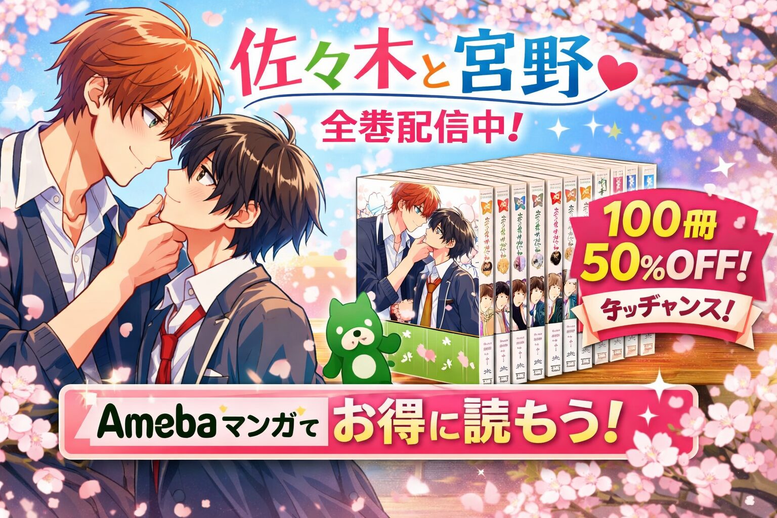 Amebaマンガなら新規登録の100冊まで50%即時還元で、全10巻を実質約2,800円で購入可能。さらに還元枠の残りでスピンオフ「平野と鍵浦」や他のBL作品もお得にまとめ買いできます。この機会に、佐々木と宮野のキュンキュンする青春を一気に体験してみてください。
