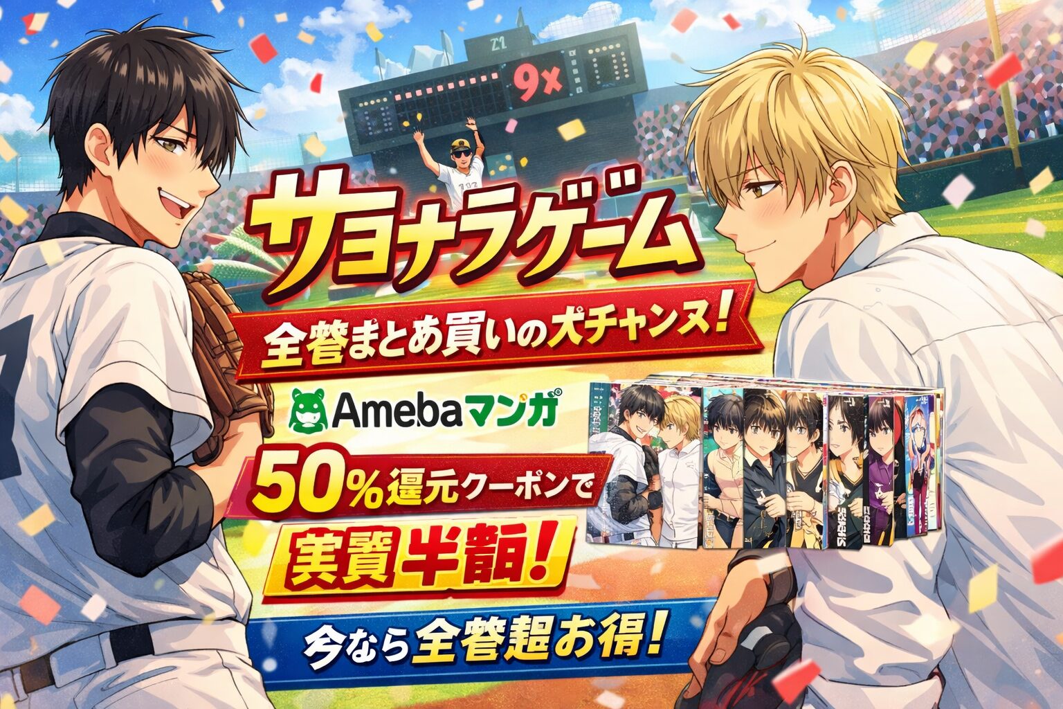 Amebaマンガ最大の強みは、新規登録時に使える「100冊まで最大50%即時還元」クーポンです。『サヨナラゲーム』シリーズは全11冊なので、すべてこのクーポンの対象範囲内に収まります。通常価格で約7,150〜8,660円かかるシリーズが、実質約3,575〜4,330円で手に入るのは、他のストアにはない圧倒的なコストパフォーマンスです。