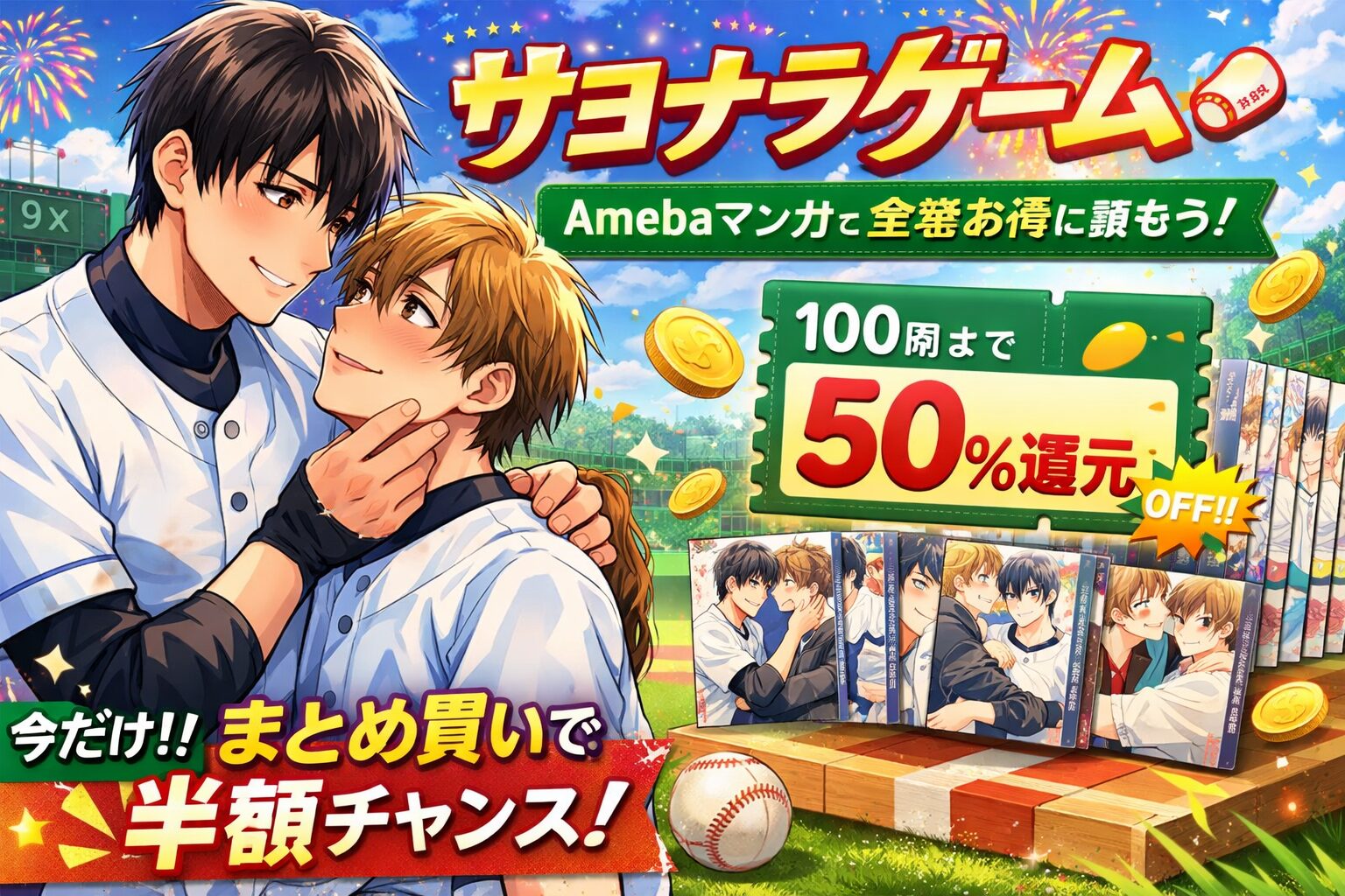 2026年3月時点で、『サヨナラゲーム』シリーズ全11巻(『サヨナラゲーム』『チェンジワールド』上下巻、『ラブネスト』上下巻、『ラブネスト2nd』上下巻、『エンゲージ』1〜4巻)はAmebaマンガで全巻配信されています。新規登録時に利用できる「100冊まで最大50%即時還元クーポン」を使えば、全巻まとめ買いでも実質半額近くで購入可能です。シリーズ全体を一度に読みたい方にとって、Amebaマンガは非常にコスパの高い選択肢となります。