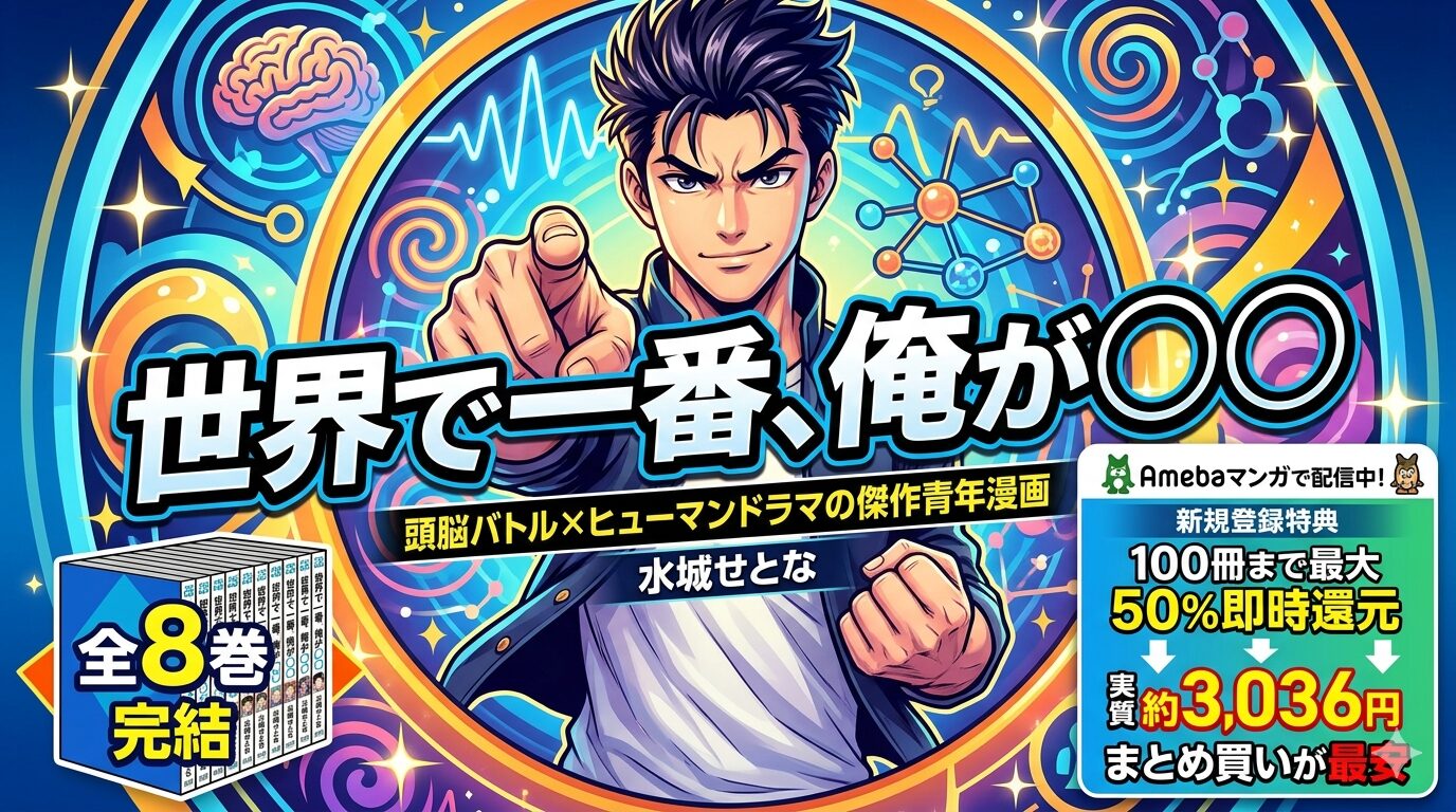 「世界で一番、俺が○○」(通称:セカオレ)は、水城せとなが描く頭脳バトル×ヒューマンドラマの傑作青年漫画です。全8巻の定価合計は6,072円(税込)ですが、Amebaマンガの新規登録特典「100冊まで最大50%即時還元」を使えば、実質約3,036円で全巻まとめ買いできます。この記事では、作品の魅力から最安で読む方法まで徹底的に解説します。