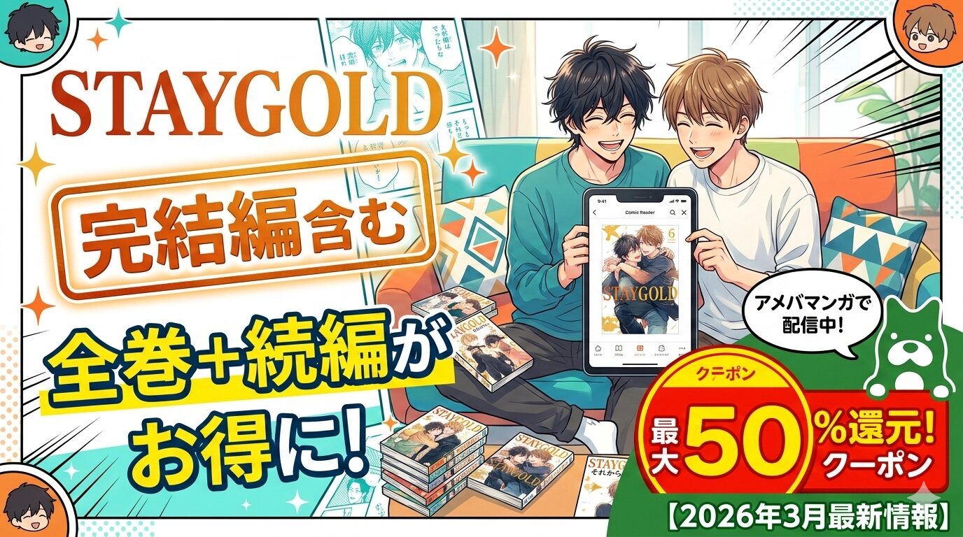 秀良子先生の名作BL漫画『STAYGOLD』(全6巻・完結)と、続編『STAYGOLD それから。』(既刊3巻・連載中)は、Amebaマンガで全巻配信中です。新規登録時の100冊まで最大50%即時還元クーポンを使えば、本編と続編あわせて全9巻を実質約2,900円でまとめ買いできます。ここでは2026年3月時点の最新情報をもとに、最安値で読む方法と作品の魅力を徹底解説します。
