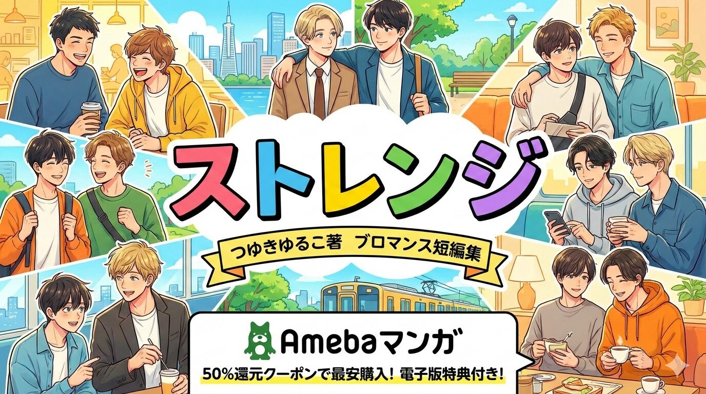 つゆきゆるこ著『ストレンジ』は、男6組12人の出会いを描いたブロマンス短編集で、全1巻完結の作品です。Amebaマンガでは電子版特典付きで配信中。新規登録の100冊50%還元クーポンを使えば、実質約370円で購入できます。