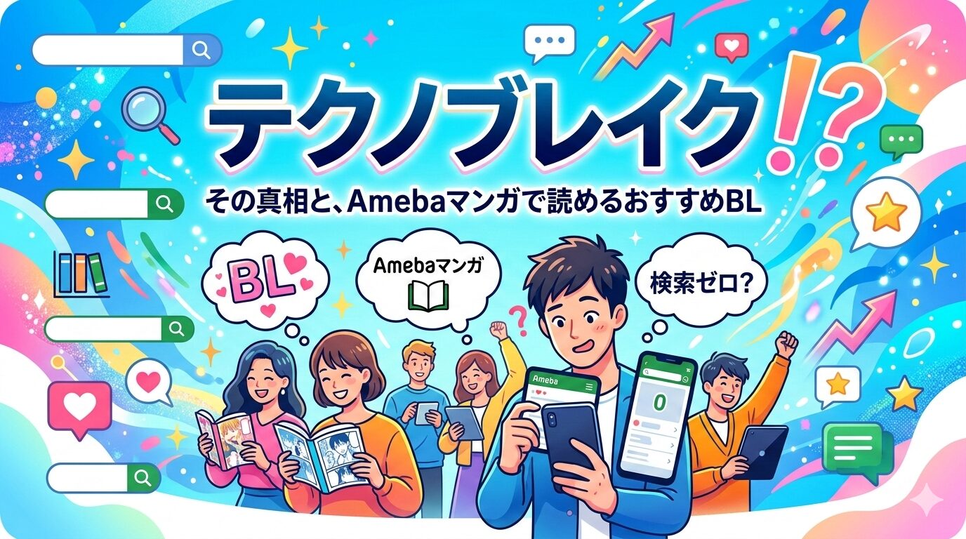結論からお伝えすると、「テクノブレイク」という名称の商業BLマンガは2026年2月26日時点で存在しません。Amebaマンガでの検索結果もゼロ件です。このページでは「テクノブレイク」の正体を整理したうえで、テクノブレイクというワードに関連するBL同人作品の情報や、Amebaマンガでまとめ買いできるおすすめBL作品をご紹介します。