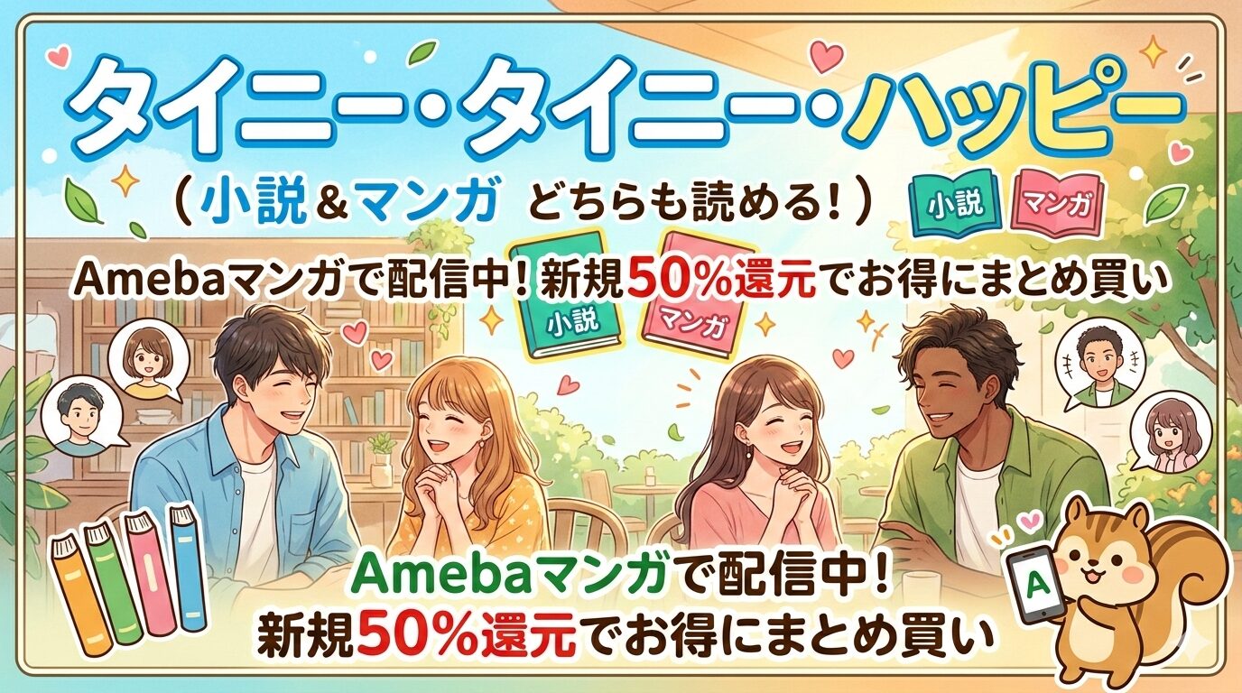 「タイニー・タイニー・ハッピー」で検索してこのページにたどり着いた方へ、最初に大切なことをお伝えします。本作はBL(ボーイズラブ)作品ではなく、男女8人の恋愛を描いた連作短編集です。ただし、Amebaマンガでは小説版・マンガ版ともに配信中で、新規登録の50%還元を使えばかなりお得にまとめ買いできます。
