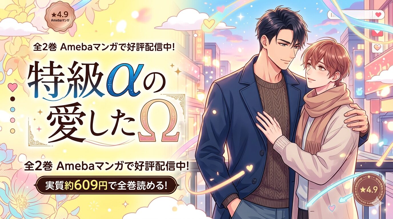 2026年2月24日時点で、「特級αの愛したΩ」はAmebaマンガにて全2巻すべてが配信されています。Amebaマンガでの評価は5点満点中4.9と非常に高く、BLジャンルの中でもトップクラスの支持を集めている作品です。新規登録者向けの100冊まで最大50%即時還元クーポンの対象となっているため、初めてAmebaマンガを利用する方であれば全巻を実質約609円で購入できます。