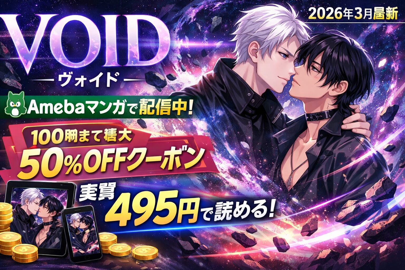 座裏屋蘭丸先生の傑作BL『VOID(ヴォイド)』を最安で読みたい方へ。結論から言うと、『VOID』はAmebaマンガで配信中であり、新規登録時の100冊まで最大50%即時還元クーポンを利用すれば、通常990円のところ実質495円相当で購入できます。全1巻完結の作品なので、一度の購入で物語を最後まで堪能できるのが大きな魅力です。