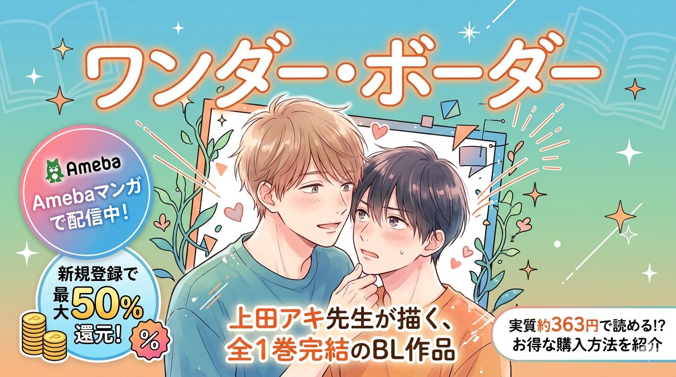 上田アキ先生のBLコミック『ワンダー・ボーダー』はAmebaマンガで配信中です。全1巻完結の本作は、新規登録時の100冊まで最大50%即時還元クーポンを使えば実質約363円で読むことができます。この記事では、作品の魅力や読者の口コミ、最もお得に読む方法を詳しく紹介します。