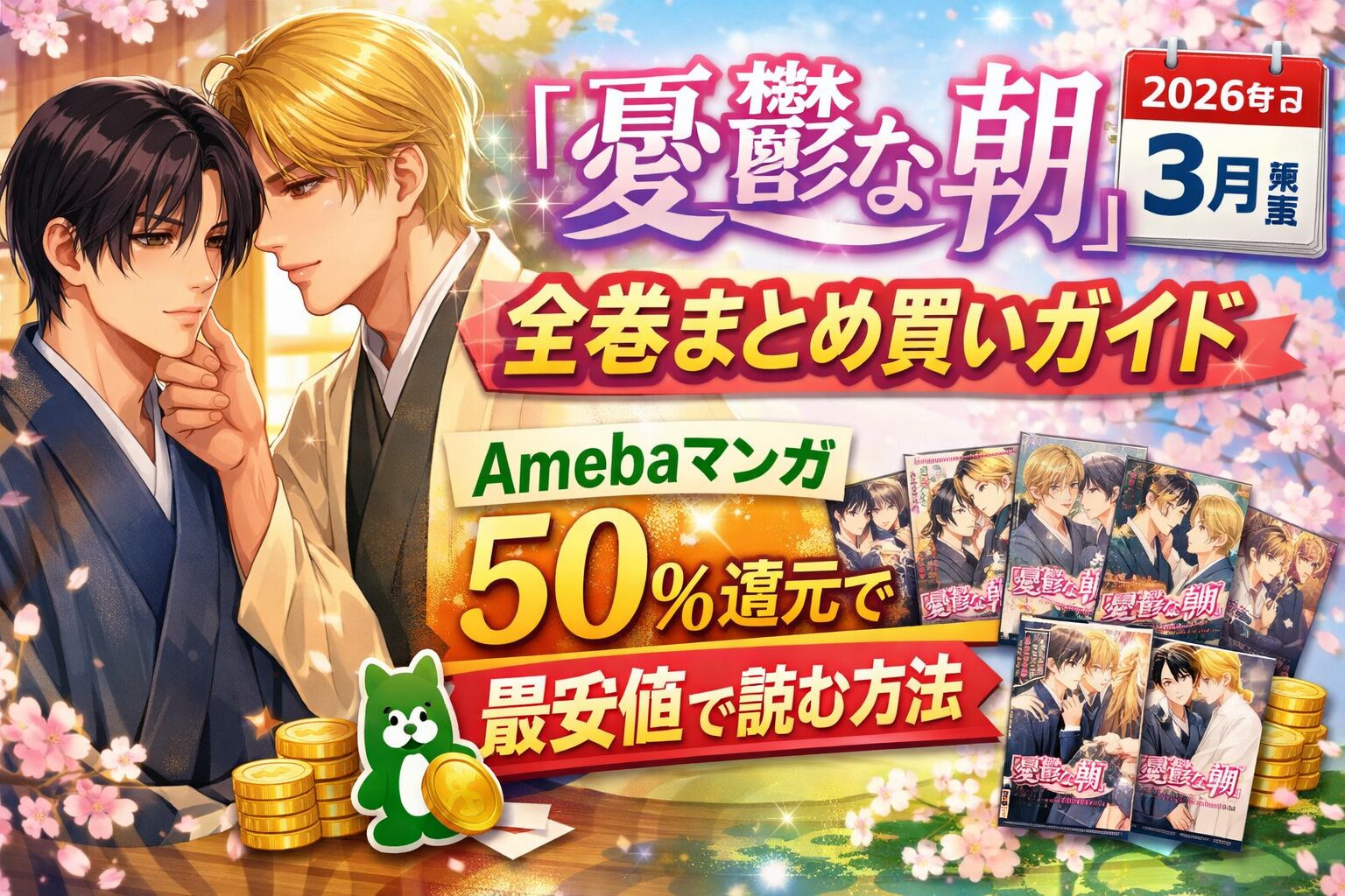 "description": "日高ショーコによる全8巻のBL大河ロマン『憂鬱な朝』を、Amebaマンガの新規登録50%還元キャンペーンでお得にまとめ買いする方法を解説します。あらすじ・受賞歴・口コミ・各巻の見どころも詳しく紹介。",